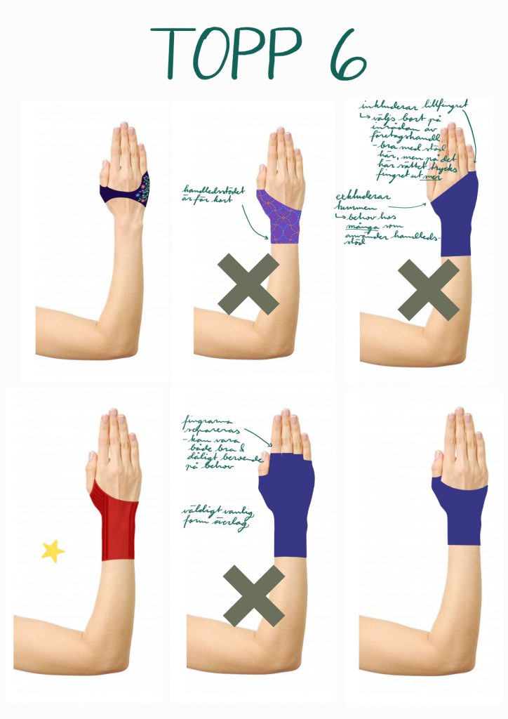 Handledsortosernas form utforskade jag med digitala skisser. Från dessa röstade en fokusgrupp fram tre alternativ som jag vidareutvecklade. Dessa nya versioner utvärderades mot samma personor som fingerortoserna, och det vinnande konceptet togs vidare.